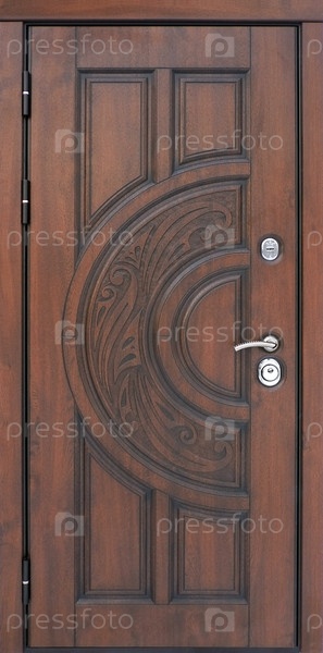 Модель входной металлической двери, изолированная на белом фоне