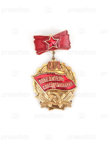 Трудовая награда Советского Союза. Надпись на знаке на русском языке означает на английском языке «Победитель социалистического соревнования»