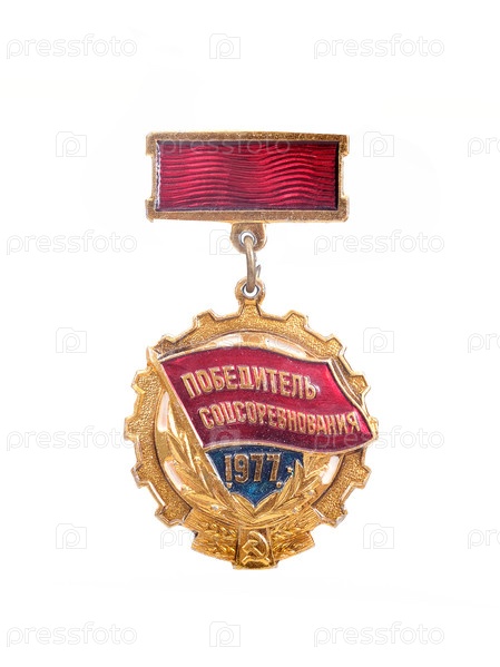 Трудовая награда Советского Союза. Надпись на знаке на русском языке означает на английском языке «Победитель социалистического соревнования»