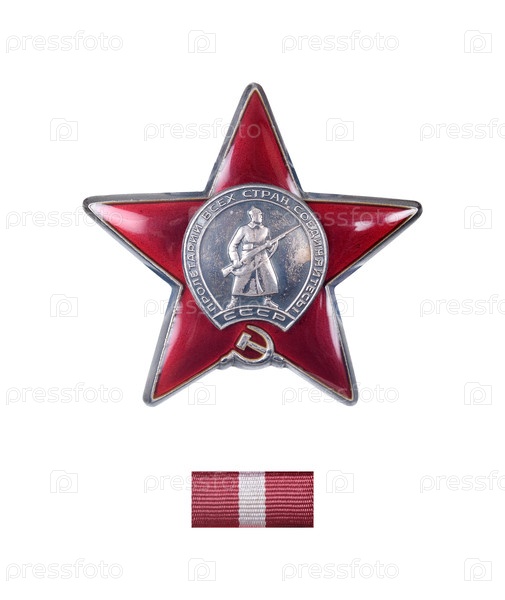 Военный орден Красной Звезды СССР, изолированный на белом фоне. Надпись на английском языке означает "Пролетарии всех стран, соединяйтесь!". Элемент дизайна с обтравочным контуром