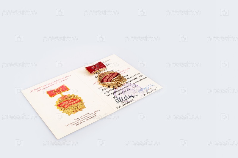 Трудовая награда Советского Союза и удостоверение личности. Надпись на знаке на русском языке означает на английском языке "Победитель социалистического соревнования"