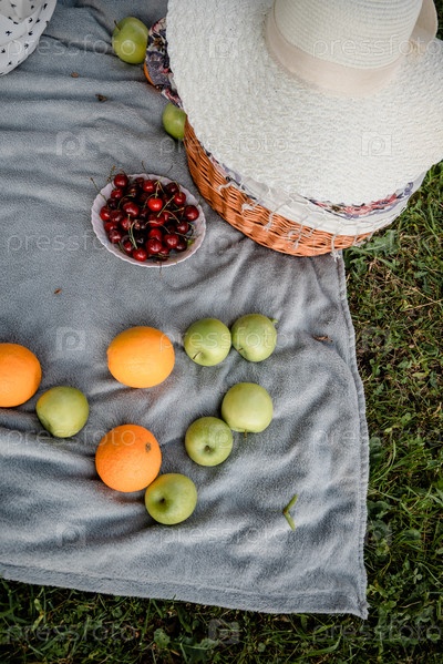 Летний пикник с фруктами на пледе без людей