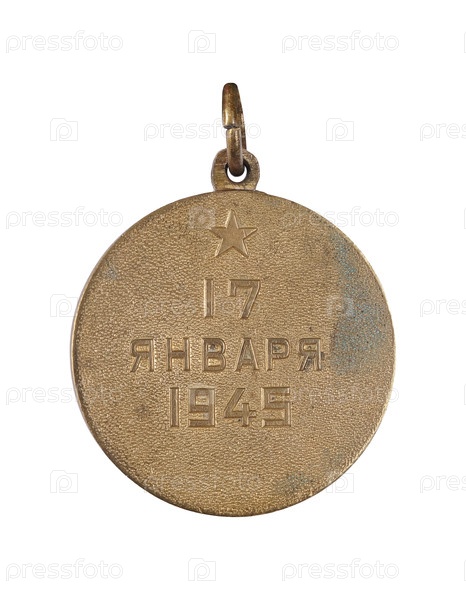 Военная медаль "За взятие Варшавы" СССР, изолированная на белом фоне. Надпись на английском языке означает "17 января 1945 года". Элемент дизайна с обтравочным контуром