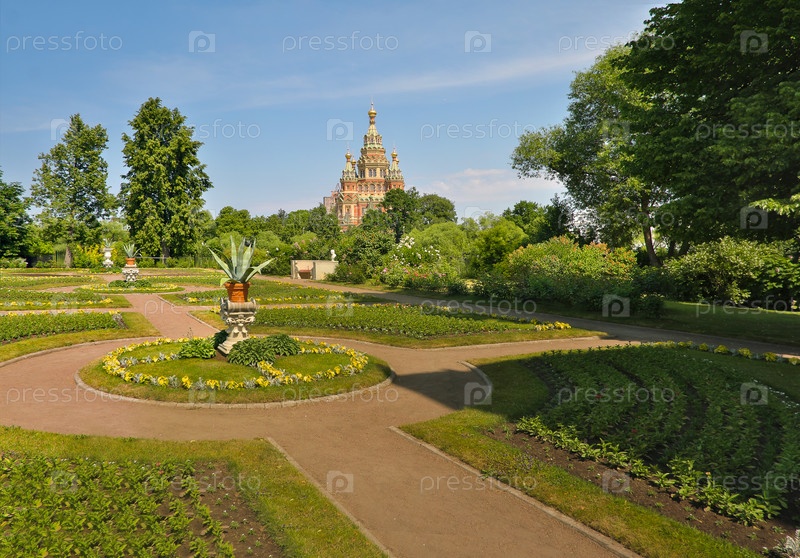 Петродворец (Петергоф, Санкт-Петербург), Сады вокруг Царицына павильона на Ольгином пруду с видом на Православный Собор Петра и Павла