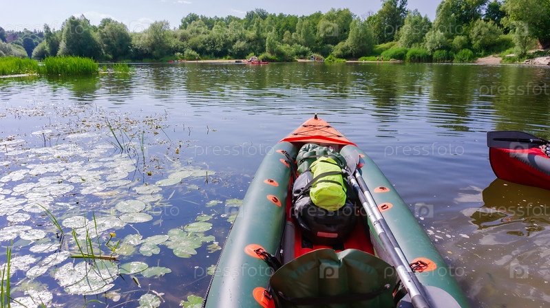 Россия - 2023, 26 июня: Надувная байдарка на берегу. Зеленая байдарка пришвартована у берега