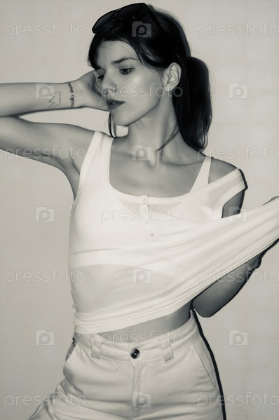 Девушка в белой майке позирует