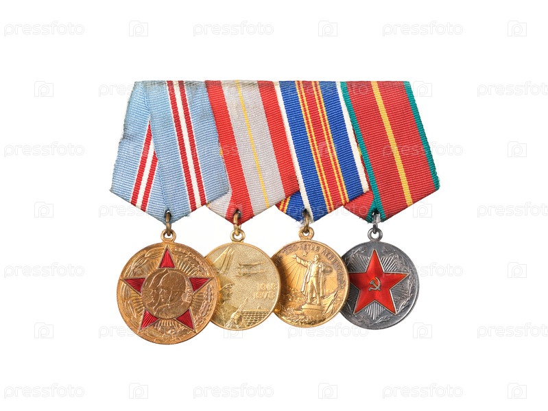 Боевые и гражданские медали времен СССР на белом фоне