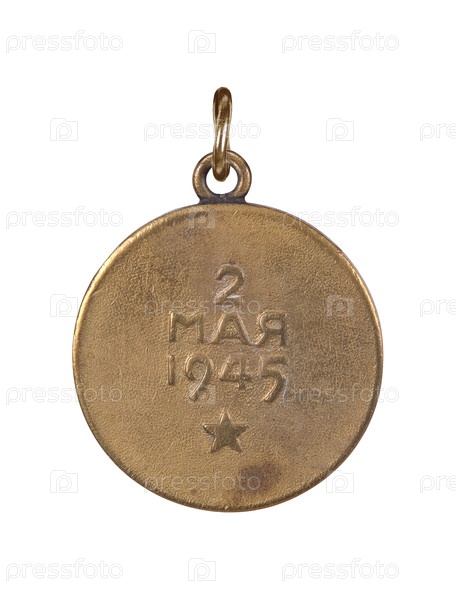 Военная медаль "За взятие Берлина" СССР, изолированная на белом фоне. Надпись на английском языке означает "2 мая 1945 года". Элемент дизайна с обтравочным контуром