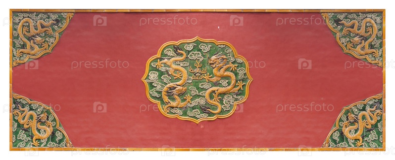 Вид на двор Запретного города (Пекин, Гугун): керамический орнамент с драконами на фоне красной стены. Элемент дизайна с обтравочным контуром