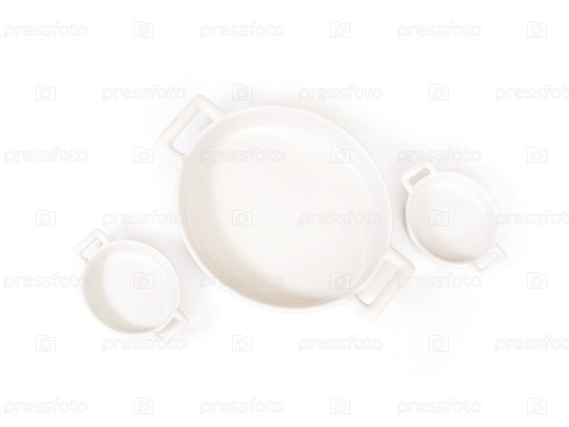 Белые фарфоровые тарелки в разных ракурсах, изолированные на белом фоне