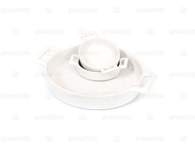 Белые фарфоровые тарелки в разных ракурсах, изолированные на белом фоне