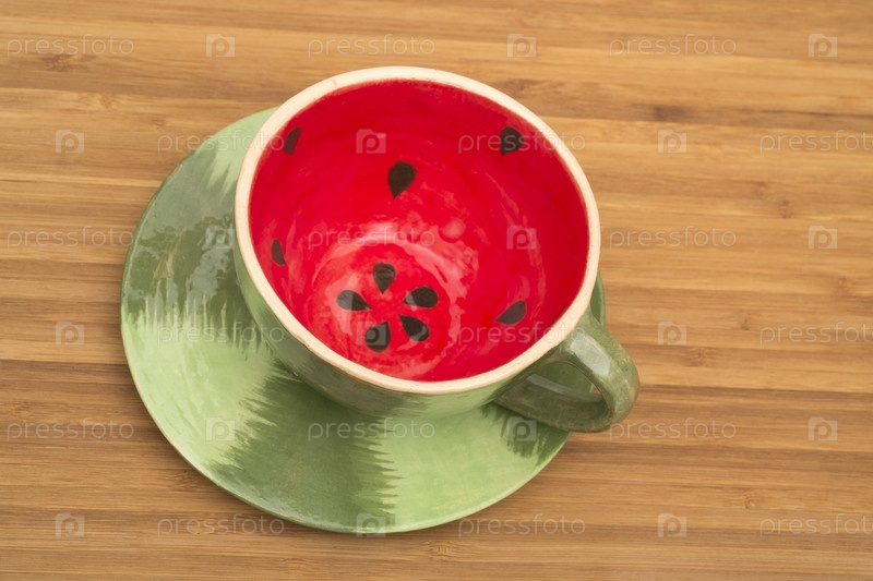 Чашка с блюдцем в форме арбуза на деревянном столе