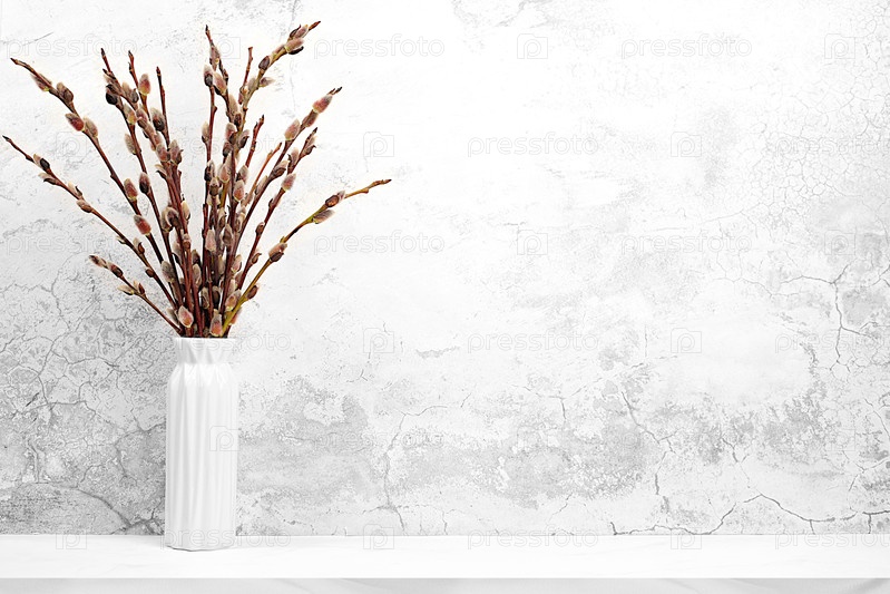 Нежные цветы вербы в вазе на сером фоне, абстрактная весенняя цветочная композиция. Пасхальная открытка и натюрморт, минималистичная концепция праздника, религиозный баннер, домашний интерьер, селективный фокус