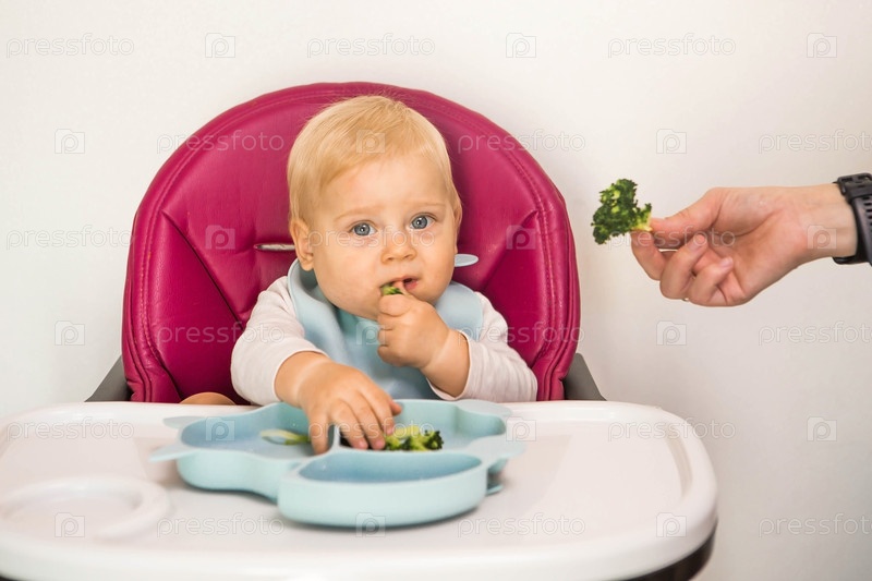 Детское питание. Первый прием пищи. Кормление ребенка. Милый маленький ребенок ест овощи. Здоровая еда. Ребенок сидит на высоком стульчике для кормления. Свежие овощи и фрукты