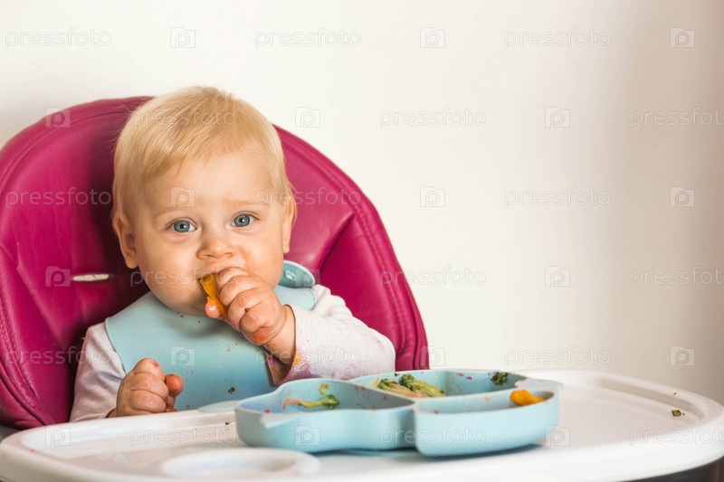 Детское питание. Первый прием пищи. Кормление ребенка. Милый маленький ребенок ест овощи. Здоровая еда. Ребенок сидит на высоком стульчике для кормления. Свежие овощи и фрукты