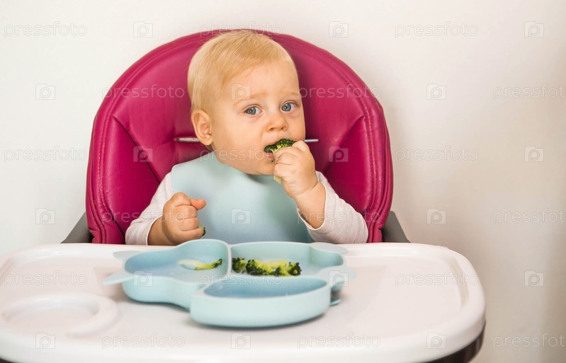 Детское питание. Первый прием пищи. Кормление ребенка. Милый маленький ребенок ест овощи. Здоровая еда. Ребенок сидит на высоком стульчике для кормления. Свежие овощи и фрукты