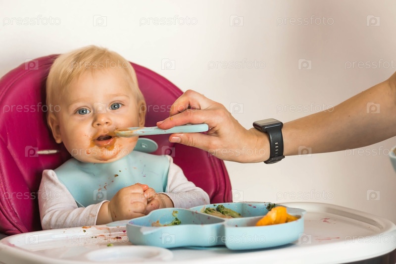 Детское питание. Первый прием пищи. Кормление ребенка. Милый маленький ребенок ест овощи. Здоровая еда. Ребенок сидит на высоком стульчике для кормления. Свежие овощи и фрукты