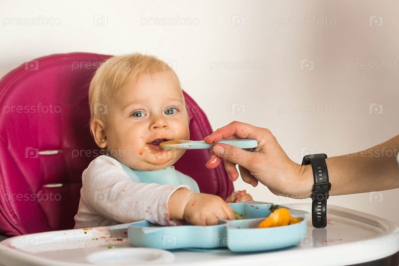 Детское питание. Первый прием пищи. Кормление ребенка. Милый маленький ребенок ест овощи. Здоровая еда. Ребенок сидит на высоком стульчике для кормления. Свежие овощи и фрукты