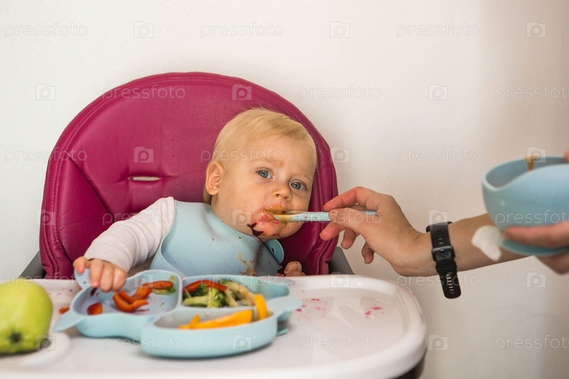 Детское питание. Первый прием пищи. Кормление ребенка. Милый маленький ребенок ест овощи. Здоровая еда. Ребенок сидит на высоком стульчике для кормления. Свежие овощи и фрукты