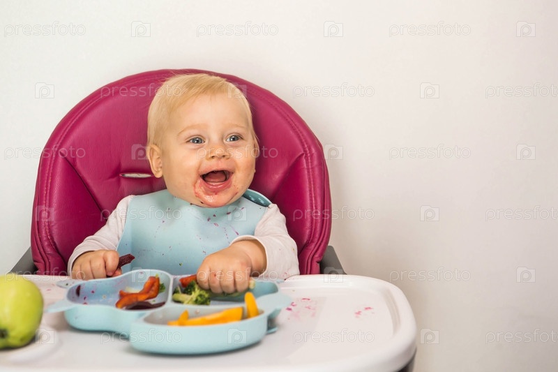 Детское питание. Первый прием пищи. Кормление ребенка. Милый маленький ребенок ест овощи. Здоровая еда. Ребенок сидит на высоком стульчике для кормления. Свежие овощи и фрукты