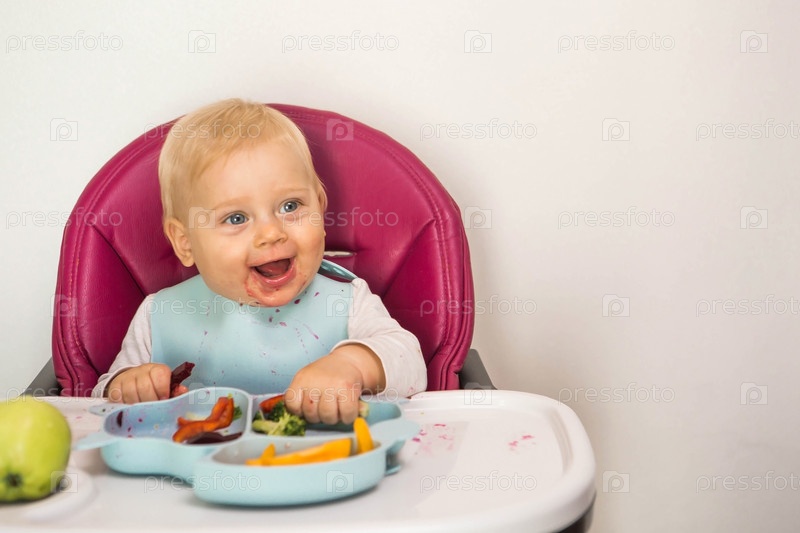 Детское питание. Первый прием пищи. Кормление ребенка. Милый маленький ребенок ест овощи. Здоровая еда. Ребенок сидит на высоком стульчике для кормления. Свежие овощи и фрукты