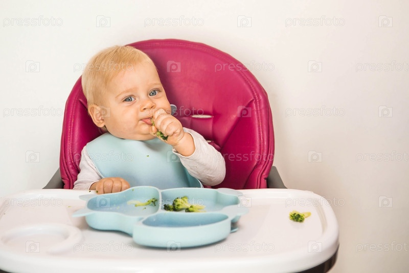 Детское питание. Первый прием пищи. Кормление ребенка. Милый маленький ребенок ест овощи. Здоровая еда. Ребенок сидит на высоком стульчике для кормления. Свежие овощи и фрукты