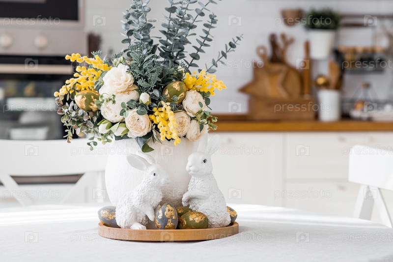 Весенний букет из роз, мимозы и эвкалипта, пасхальные кролики и яйца с золотым узором на столе. На заднем плане изображена белая кухня. Красивая пасхальная открытка