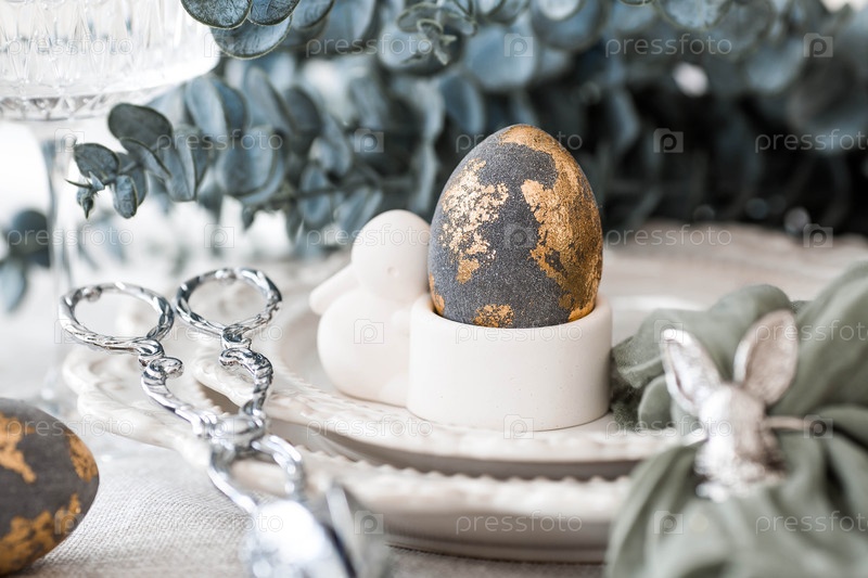 Баннер. Сервировка стола. Тарелка с кроликом и салфеткой, пасхальные яйца с позолотой и ветка эвкалипта на льняной скатерти. Концепция светлого праздника Пасхи