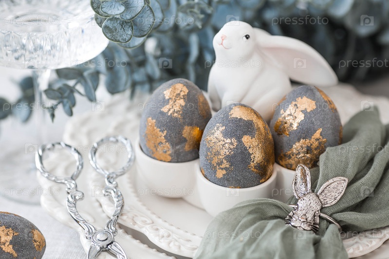 Баннер. Сервировка стола. Тарелка с кроликом и салфеткой, пасхальные яйца с позолотой и ветка эвкалипта на льняной скатерти. Концепция светлого праздника Пасхи