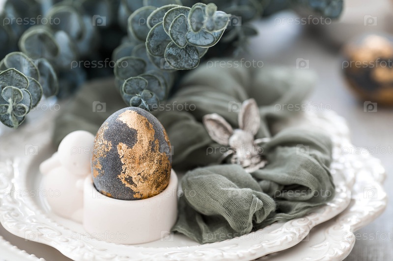 Баннер. Сервировка стола. Тарелка с кроликом и салфеткой, пасхальные яйца с позолотой и ветка эвкалипта на льняной скатерти. Концепция светлого праздника Пасхи