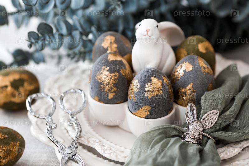 Баннер. Сервировка стола. Тарелка с кроликом и салфеткой, пасхальные яйца с позолотой и ветка эвкалипта на льняной скатерти. Концепция светлого праздника Пасхи
