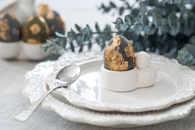 Баннер. Сервировка стола. Подставка для яиц с кроликом, пасхальные яйца с позолотой и ветка эвкалипта на льняной скатерти. Концепция светлого праздника Пасхи