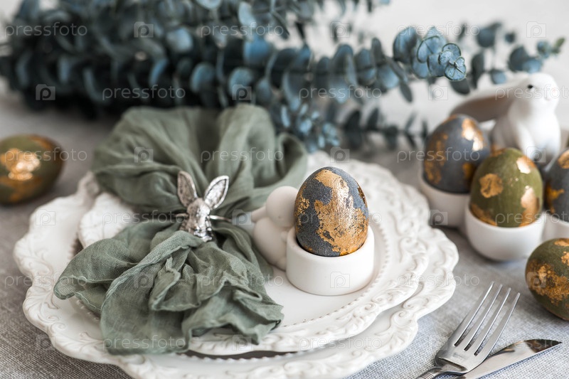 Баннер. Сервировка стола. Тарелка с кроликом и салфеткой, пасхальные яйца с позолотой и ветка эвкалипта на льняной скатерти. Концепция светлого праздника Пасхи