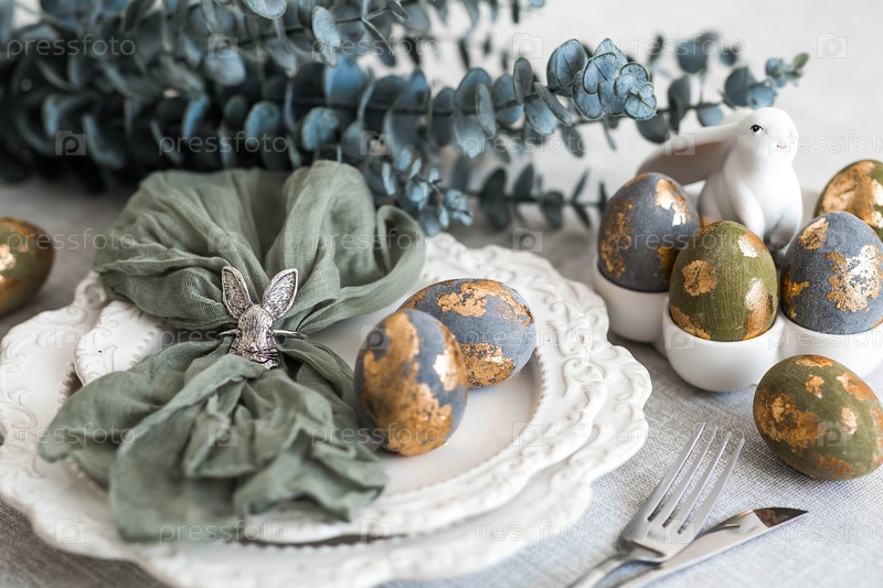 Баннер. Сервировка стола. Тарелка с кроликом и салфеткой, пасхальные яйца с позолотой и ветка эвкалипта на льняной скатерти. Концепция светлого праздника Пасхи