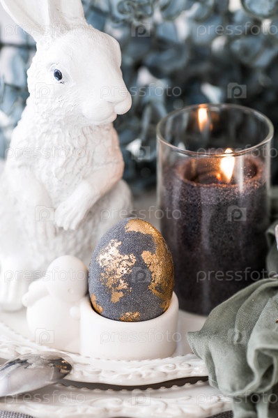 Тарелка с кроликом и салфеткой, свеча, пасхальные яйца с позолотой и ветка эвкалипта на льняной скатерти. Концепция светлого праздника Пасхи