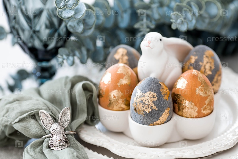 Баннер. Сервировка стола. Тарелка с кроликом и салфеткой, пасхальные яйца с позолотой и ветка эвкалипта на льняной скатерти. Концепция светлого праздника Пасхи