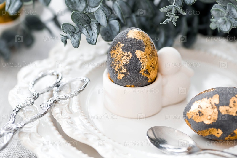 Баннер. Сервировка стола. Подставка для яиц с кроликом, пасхальные яйца с позолотой и ветка эвкалипта на льняной скатерти. Концепция светлого праздника Пасхи