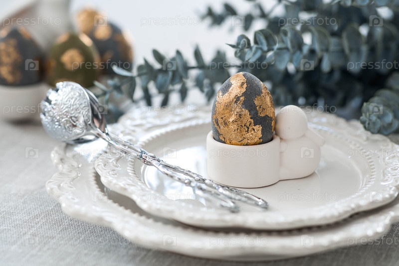 Баннер. Сервировка стола. Подставка для яиц с кроликом, пасхальные яйца с позолотой и ветка эвкалипта на льняной скатерти. Концепция светлого праздника Пасхи