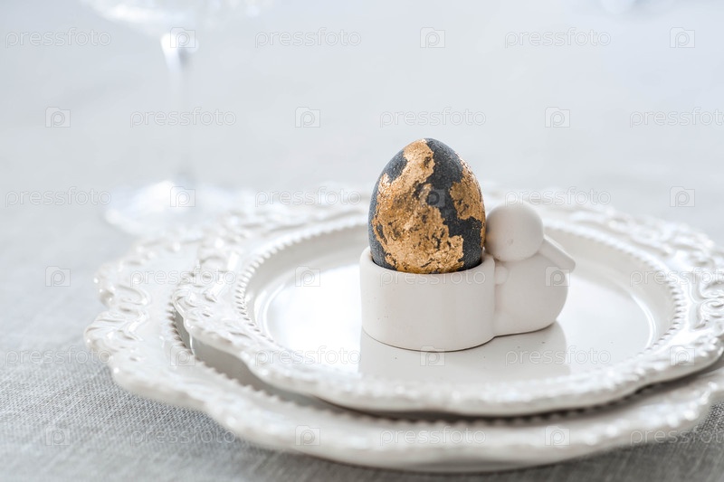 Баннер. Сервировка стола. Подставка для яиц с кроликом, и пасхальные яйца с позолотой на льняной скатерти. Концепция светлого праздника Пасхи