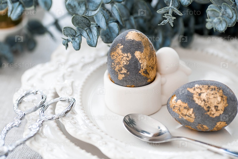 Баннер. Сервировка стола. Подставка для яиц с кроликом, пасхальные яйца с позолотой и ветка эвкалипта на льняной скатерти. Концепция светлого праздника Пасхи