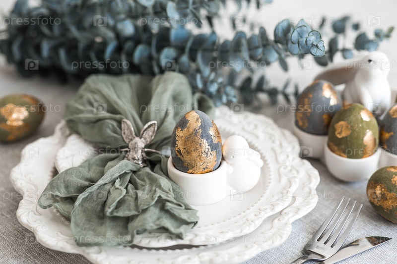 Баннер. Сервировка стола. Тарелка с кроликом и салфеткой, пасхальные яйца с позолотой и ветка эвкалипта на льняной скатерти. Концепция светлого праздника Пасхи