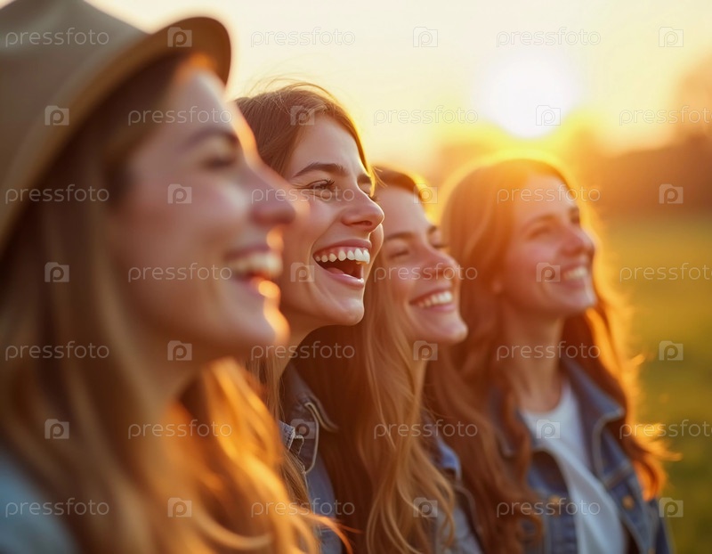 Группа друзей наслаждается теплым сиянием заходящего солнца, смеясь и лелея момент. Их беззаботные улыбки отражают счастье совместных приключений на природе