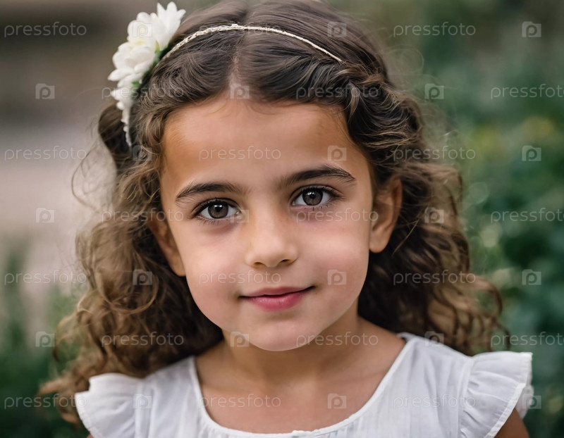 Играющая молодая девушка с извивающимися волосами и цветочным аксессуаром нежно улыбается в пышном саду Израиля, излучая радость и любопытство в прекрасный день