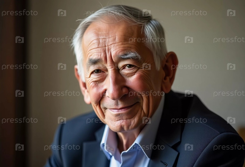Пожилой азиатский мужчина удобно сидит в теплой, гостеприимной обстановке.Его мягкая улыбка отражает мудрость и жизненный опыт, а нежные лучи дневного света освещают его черты лица