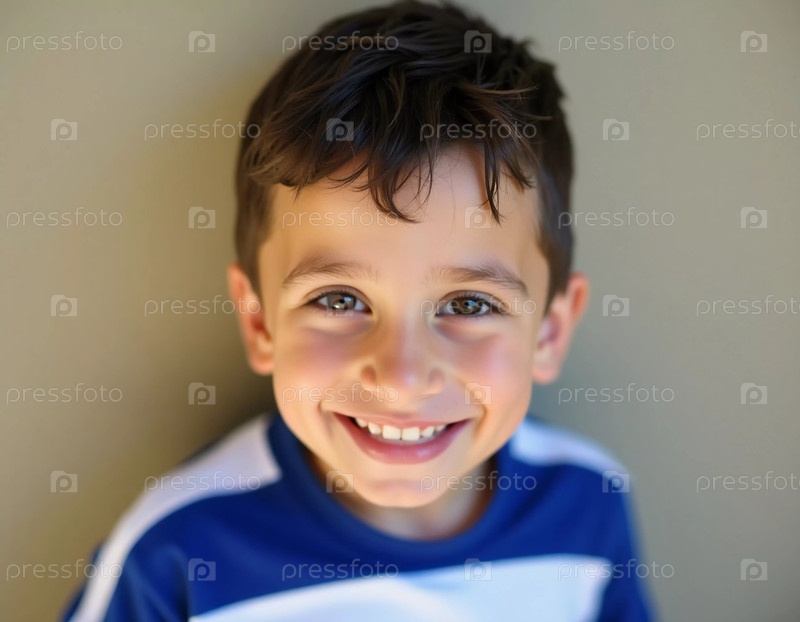 Веселый мальчик стоит на мягком фоне, демонстрируя свою яркую улыбку и сверкающие голубые глаза. Его радость отражает тепло солнечного дня в Израиле, запечатлевая момент чистого счастья