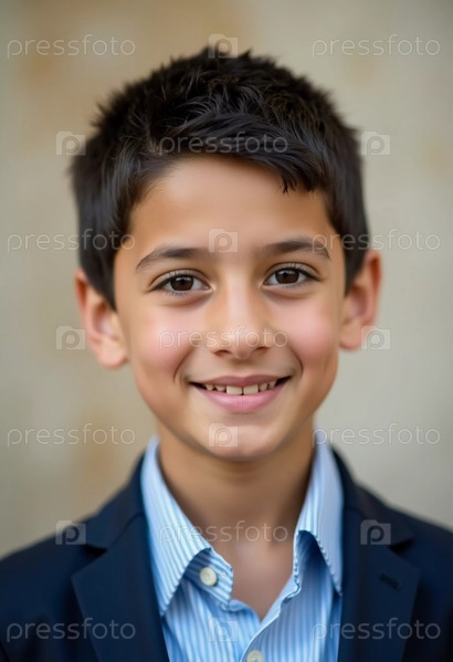Веселый мальчик, одетый в строгий костюм, сияет от радости, стоя перед мягко размытой текстурированной стеной. Его яркая улыбка излучает счастье, демонстрируя дух молодости в Израиле