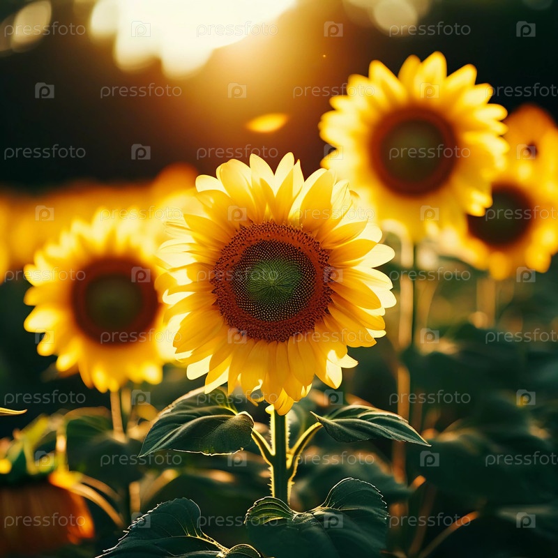 На сияющем поле желтых подсолнухов золотистые цветы тянутся к солнцу, освещенные теплыми лучами в тихий полдень, демонстрируя яркую палитру природы
