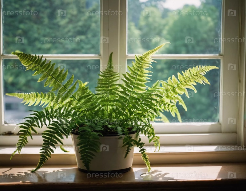 Яркий папоротник нефролепис элегантно расположился на залитом солнцем подоконнике, его пышные листья грациозно ниспадают каскадом. Мягкий солнечный свет усиливает зеленые оттенки, создавая спокойную атмосферу