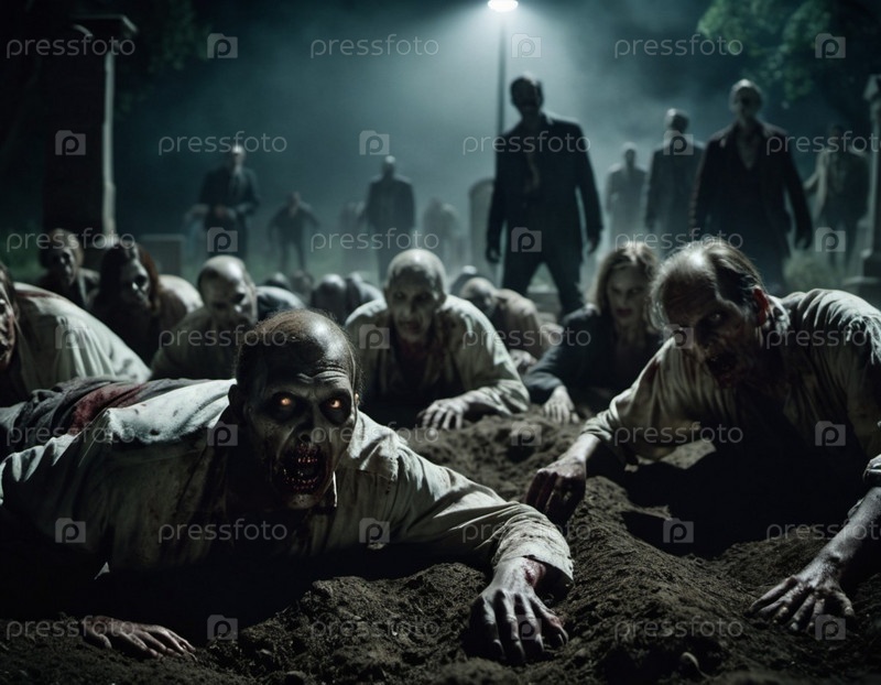 Зомби восстают из земли на тревожном кладбище. Безжизненные выражения лиц, рваная одежда раскрывают преследующее прошлое. Тусклый свет создает атмосферу ужаса. Надгробия, жуткая атмосфера, разложение и ужас. ИИ