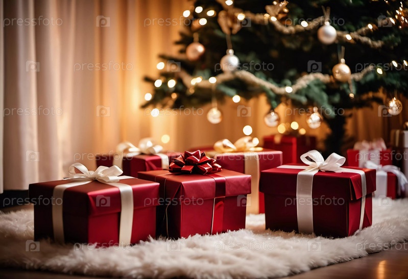 Уютная гостиная, украшенная праздничной рождественской елкой, украшенной сверкающими огнями и красочными безделушками, окруженная множеством тщательно упакованных подарочных коробок, ожидающих открытия. Искусство ИИ